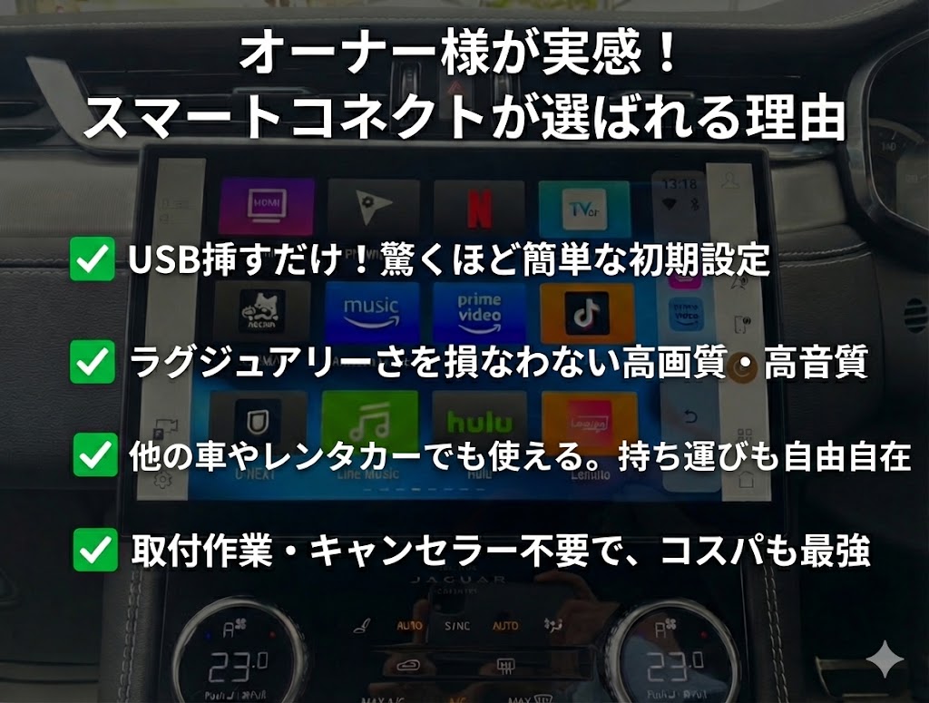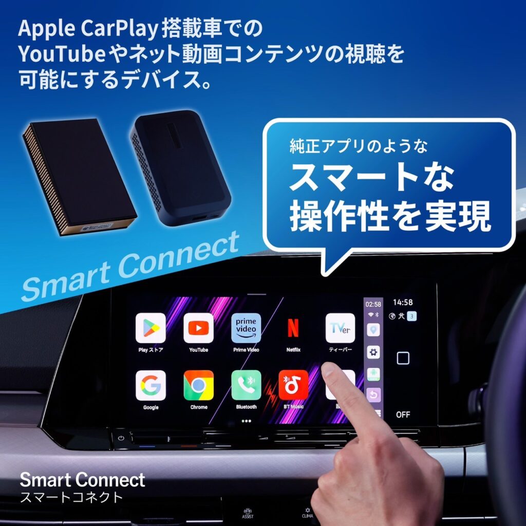 スマートコネクトは、Apple CarPlay(アップルカープレイ)を搭載した車両で、YouTube(ユーチューブ)やNetflixなどの動画配信アプリを快適に観られる映像再生デバイスです。